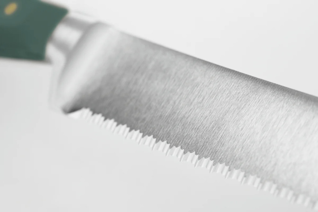 Különleges fogazott élével és öt új jellegzetes markolatszínével a Wüsthof Classic Colour 23 cm-es duplafogazott kenyérkésünk mindenki számára tökéletes választás. Ez a kenyérkés nemcsak a ropogós kenyérszeleteket vagy a frissen sült zsemléket és süteményeket vágja könnyedén, hanem nagy gyümölcsök, kemény héjú zöldségek vagy vasárnapi sültek szeletelésére is tökéletesen alkalmas. A duplafogazott él (fogazatok a fogazatok között) segít a pengének hosszabb ideig éles maradni, és minimális nyomással tiszta, egyenletes vágásokat eredményez. Az öt gyönyörű új markolatszín közül bármelyiket is választja, ez a kés extra adag önkifejezést (és stílust) ad a vágódeszkához a következő vacsorapartin, vagy a konyhában az Ön oldalán.
