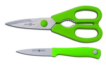 Wüsthof Silverpoint Zöldségkés 8 cm-es pengével és Konyhai Olló zöld színben.